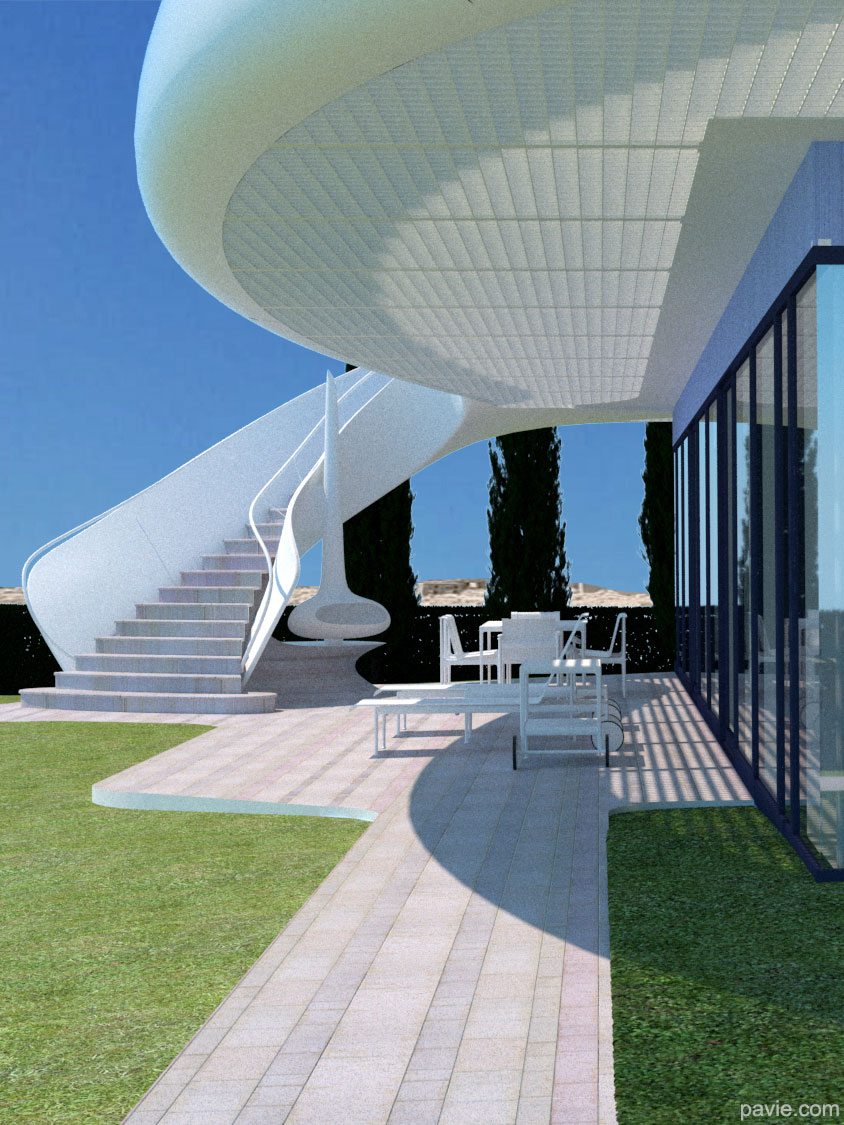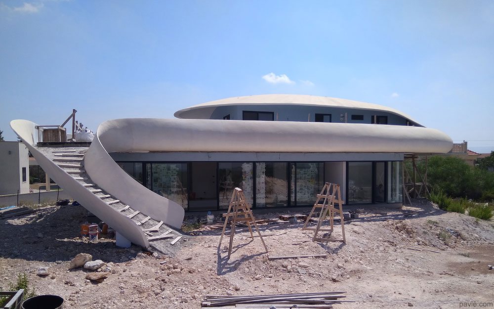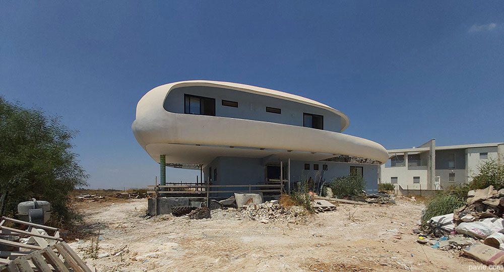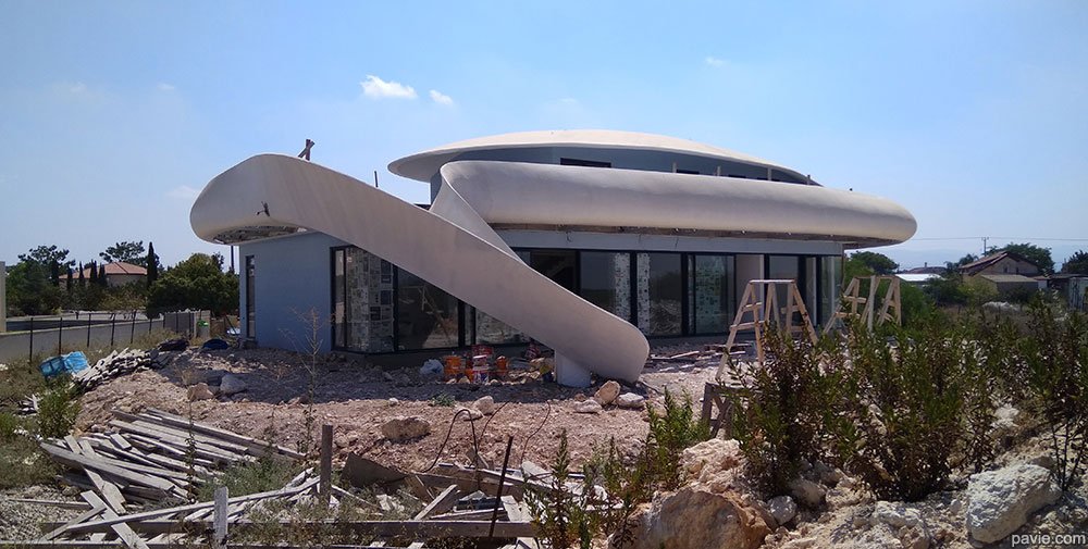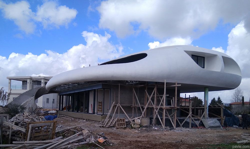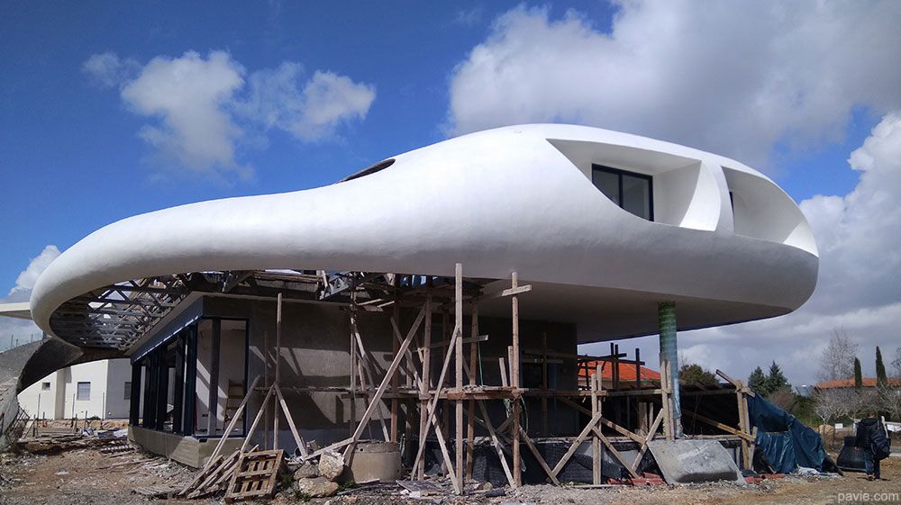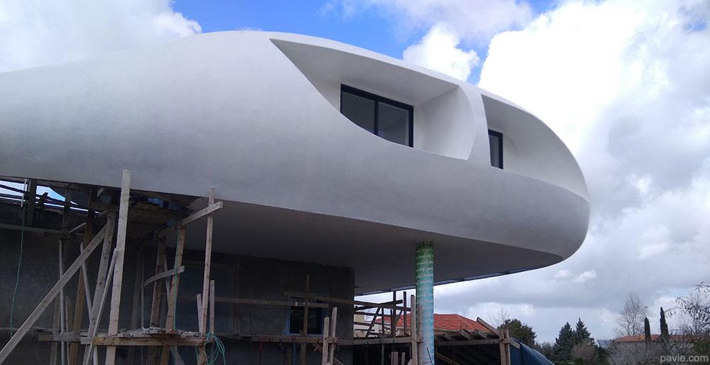 הבית מורכב מחלוקה פנימית קונבציונלית וחזית זכוכית לכיוון הנוף. חוץ - קווים אירו-דינאמיים זורמים עם הנוף, חללי צל גדולים עם מרפסת ענק מול הנוף. הרגשה של "להיות בספינה / יאכטה / חללית ולשוט מעל פני הנוף"