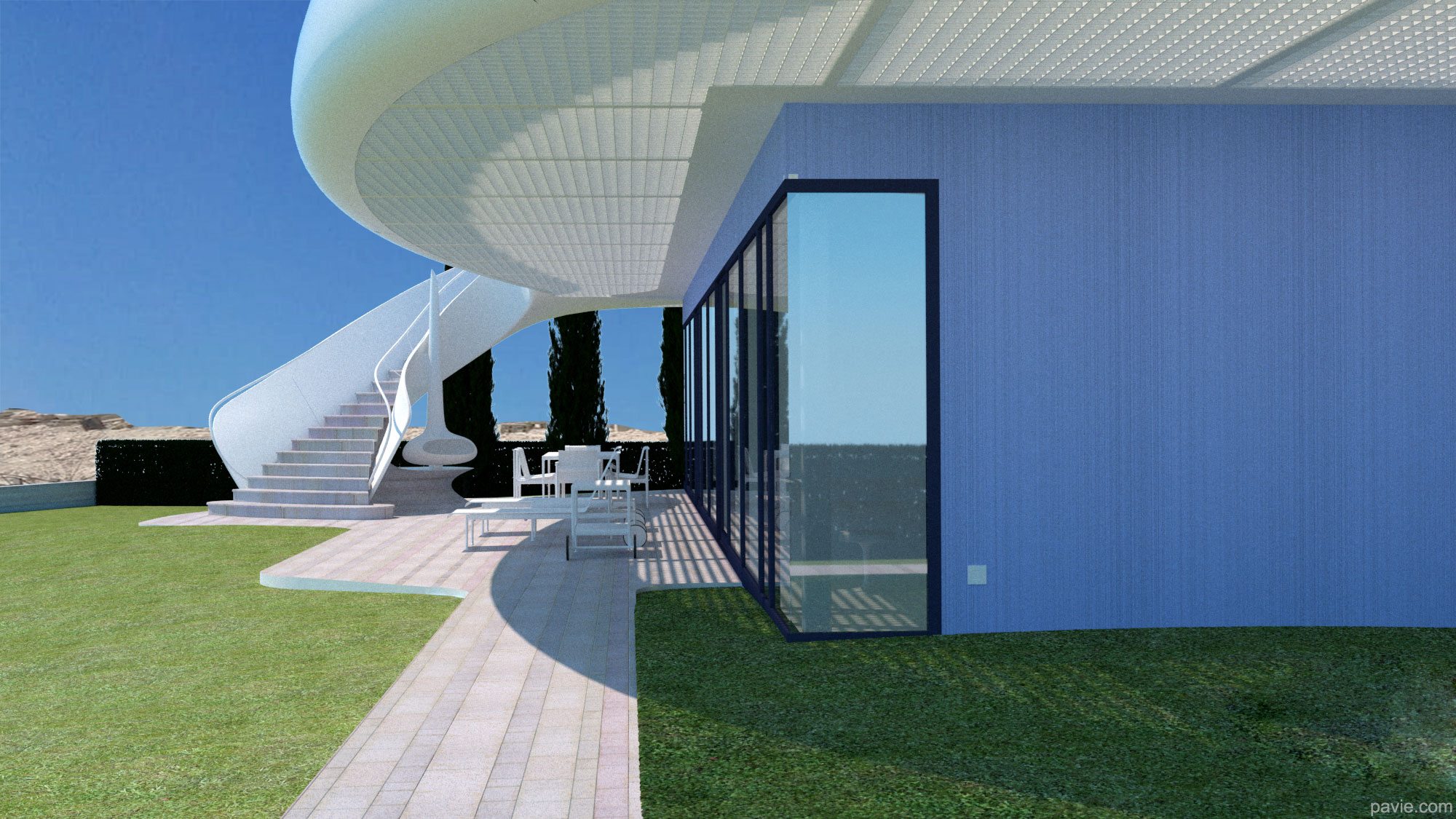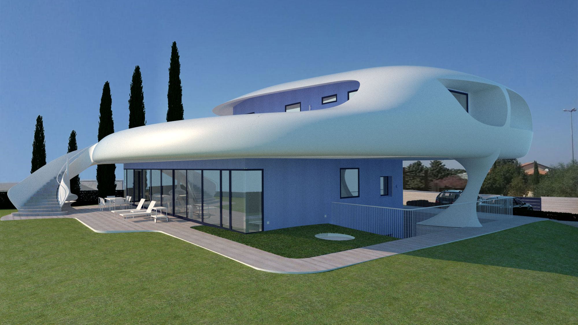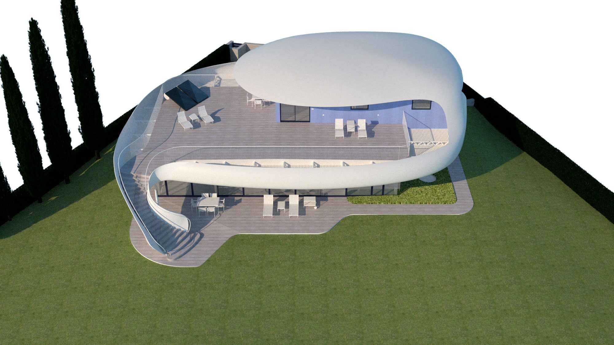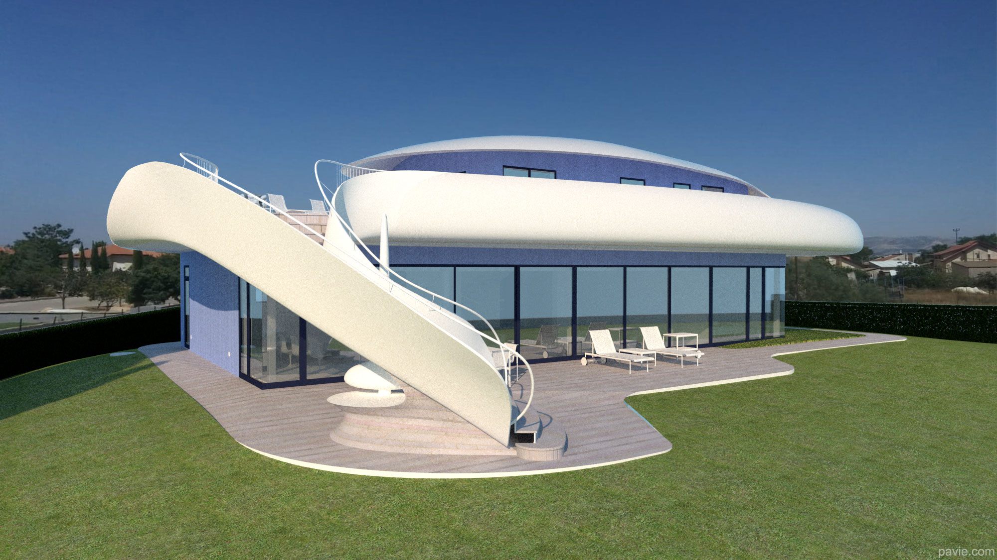 הבית מורכב מחלוקה פנימית קונבציונלית וחזית זכוכית לכיוון הנוף. חוץ - קווים אירו-דינאמיים זורמים עם הנוף, חללי צל גדולים עם מרפסת ענק מול הנוף. הרגשה של "להיות בספינה / יאכטה / חללית ולשוט מעל פני הנוף"